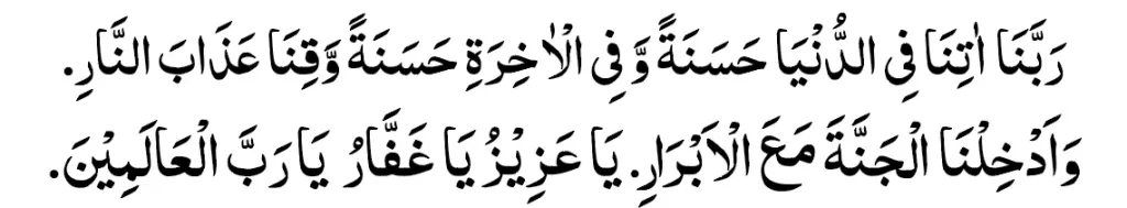 উচ্চারণঃ রব্বানা আতিনা ফিদ্দুনিয়া, হাসানাতাও ওয়াফিল আখিরাতি হাসানাতাও ওয়াক্বিনা আজাবাননার ।
